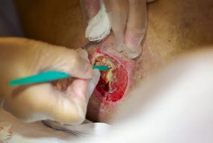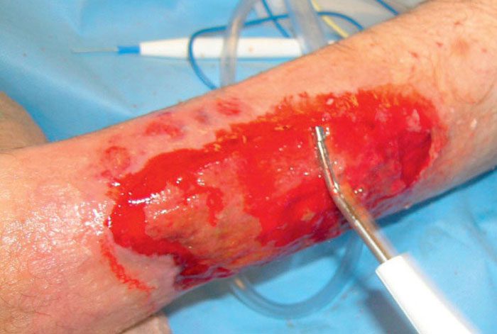 - بافت نکروزه و غیرزنده برداشته شده و زخم تمیز می شود.