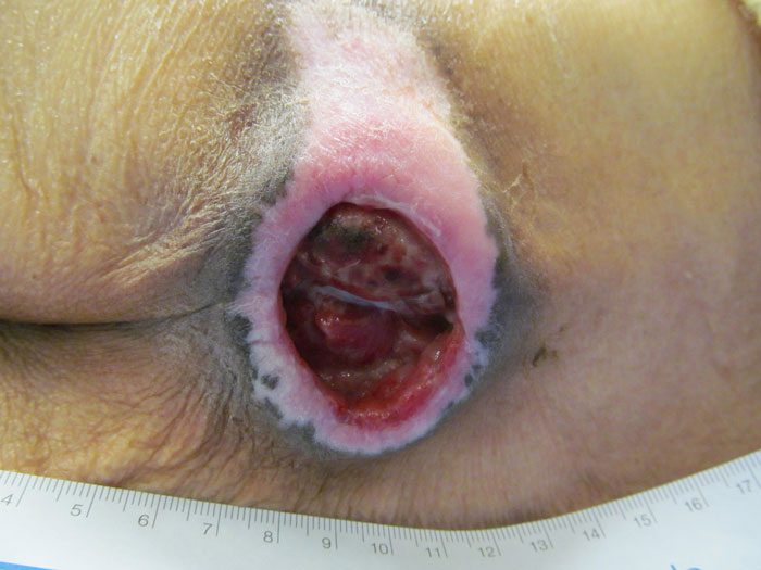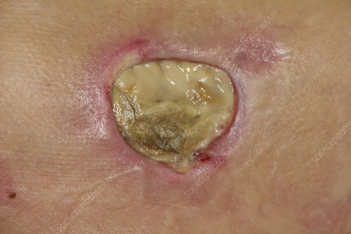 از بین رفتن کامل بافت وجود دارد و زخم، بافت مرده را به طور کامل می پوشاند. تجزیه جراحی بافت مرده یا اسکار (در صورت امکان بالینی) برای آشکار شدن پایه زخم مورد نیاز است.