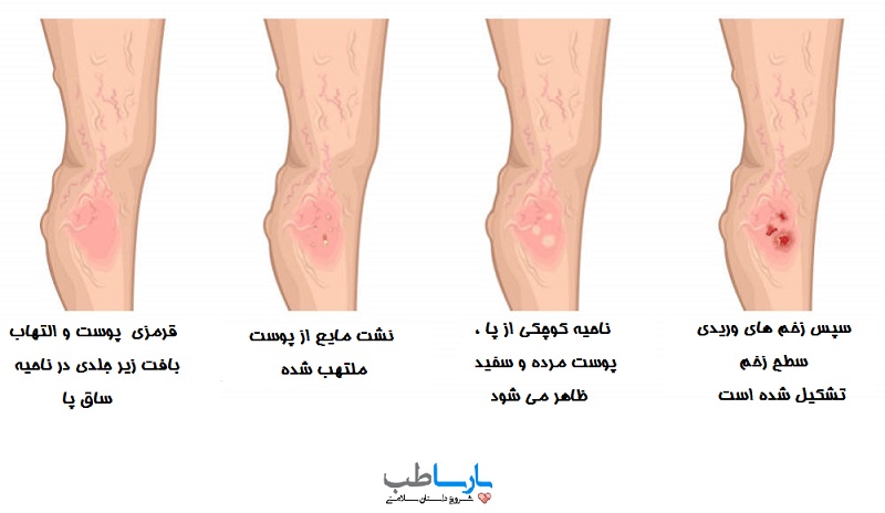 ورید های واریسی: وجود رگ های برآمده و بزرگ در ساق پا که دیگر به خوبی عمل نمی کنند، سبب تجمع خون می شود که می تواند منجر به ایجاد زخم شود.