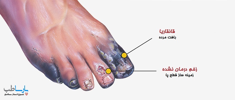 اگر زخم پای دیابتی به موقع درمان نشود، ممکن است بافت های پوستی مجاور زخم به دلیل کمبود خون و اکسیژن بمیرند، که این امر منجر به تشکیل بافت سیاهی به نام ایسکمی می شود. ایسکمی یکی از اولین علائم قانقاریا در پا است. گانگرن می تواند به کل پا گسترش یابد و منجر به مرگ بافت ها و قسمت هایی از پا شود.