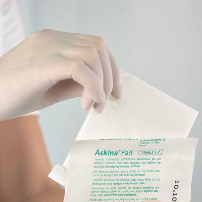 Askina®Pad یک کمپرس استریل و غیر چسبنده با قدرت جذب بالا برای انواع زخم های ترشح دارAskina®Pad S یک کمپرس باشکاف باریک، استریل و غیر چسبنده است که قدرت جذب بالایی را برای پوشش درن ها و تیوب های تغذیه ایی دارد. این پانسمان یک شکاف مرکزی دارد که برای استفاده جهت تیوب هایی که حداکثر 11 میلیمتر ضخامت دارد مناسب است و یک شکاف باریک برای پیچیدن به اطراف تیوب.