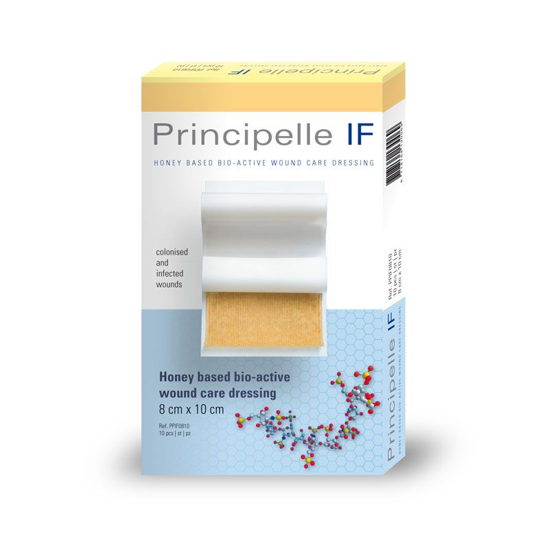 Principelle IF بعلت داشتن مقادیر زیادی از ترکیبات فرمولی دارای بیشترین خاصیت آنتی اکسیدان و آنتی باکتریال در میان عسل هاست ؛ عسل موجود در این محصول با تحریک سلول های فیبرو بلاست که در ترمیم و بسته شدن زخم فعالیت دارند باعث تسریع بهبودی زخم میشود. پرینسیپل آی اف محیط زخم را با میکروارگانیسم ها متعادل می کند. این امر موجب ایجاد شرایط بهتر برای بازسازی بافت پوست می شود. تعادلی از وجود میکروارگانیسم های مورد نیاز در محیط زخم به تسریع بهبودی کمک می کند. ویژگی های پرینسیپل آی اف تسهیل تنظیم رطوبت در محیط زخم و تنظیم pH در سطح زخم در طی روند بهبود است. پانسمان عسل پرینسیپل آی اف زخم را در برابر آسیب های مکانیکی محافظت می کند و از خارج شدن ترشحات اضافه زخم جلوگیری می کند. این پانسمان در در کاهش تشکیل اسکار و کمک به دبرید و کاهش فعالیت التهابی زخم بسیار موثر است. پانسمان عسل پرنسیپل آی اف یک پانسمان استریل زخم است که حاوی یک اسید استات غیر فعال است که ترکیبی از عسل پزشکی وعناصر کمیاب است. فرمول پانسمان حاوی ترکیبات مصنوعی نمی باشد. مواد معدنی، عناصر کمیاب و اکسید ها به طور مستقیم با عسل گندم سیاه یا باک ویت ترکیب شده اند. پانسمان آنتی باکتریال عسل محیط زخم را با میکروارگانیسم ها متعادل می کند. این امر موجب ایجاد شرایط بهتر برای بازسازی بافت پوست می شود. خصوصیات و مقدار کلنی باکتریایی و نحوه ترکیب با این نوع عسل پزشکی به خوبی شناخته شده است.