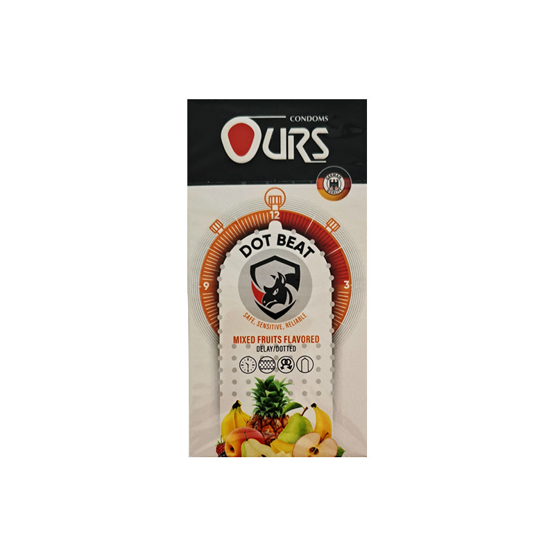 کاندوم Ours مدل Dot Beat حاوی مواد روان کننده جهت مقاربت بدون درد و خارهای آناتومیک جهت تحریک نقطه جی (G Spot) بانوان برای لذت و انزال زودتر می باشد. همچنین این محصول دارای ماده موثر تاخیری بنزوکائین می باشد که از انزال زودرس جلوگیری کرده و رابطه طولانی و لذت بخش را به شما و شریک جنسیتان هدیه می دهد. این کاندوم دارای مخزن اطمینان جهت امنیت بیشتر در حین رابطه می باشد. در بسیاری از موارد مشکل انزال زودرس در مردان زیاد است. این نیاز شدید به درمان زود انزالی سبب تولید نسل جدیدی از کاندوم ها شده که میزان بالا رفتن مدت زمان رابطه جنسی با کمک آن ها خیلی بیشتر از کاندوم های معمولی است.